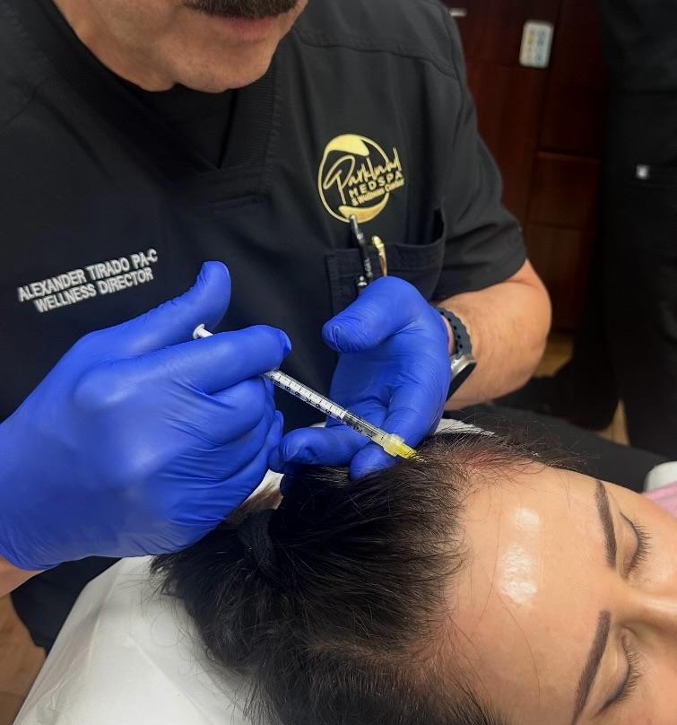 Parkland Medspa and Wellness Center in Riverstone Shoppes in Parkland hair restoration is performed by our Wellness Director Alex Tirado who has 15 years of expertise in PRP (Platelet-Rich Plasma) hair restoration, a procedure that uses a patient’s own blood to stimulate hair growth. PRP hair restoration involves drawing blood, processing it to concentrate platelets, and then injecting this platelet-rich plasma into the scalp to promote hair follicle activity and potentially reverse hair loss.